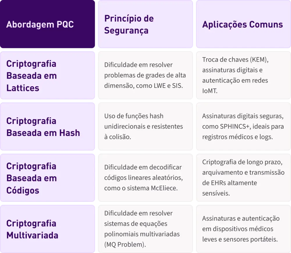 A seguir, são apresentadas as principais famílias de algoritmos pós-quânticos e seus princípios de segurança, bem como as aplicações mais relevantes no contexto da saúde digital e do IoMT: